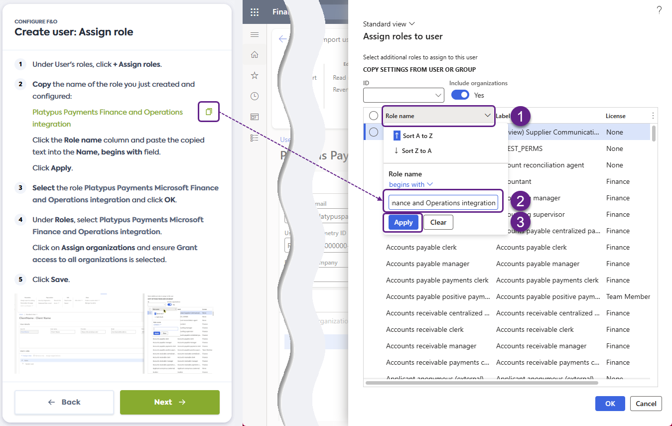 Next, click the Role name in the Assign toles to user window, paste the name into the Name, begins with field, and click Apply.