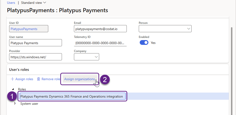 Continue with the following steps in Microsoft Dynamics 365 F&O to assign the role you previously created to the new user: